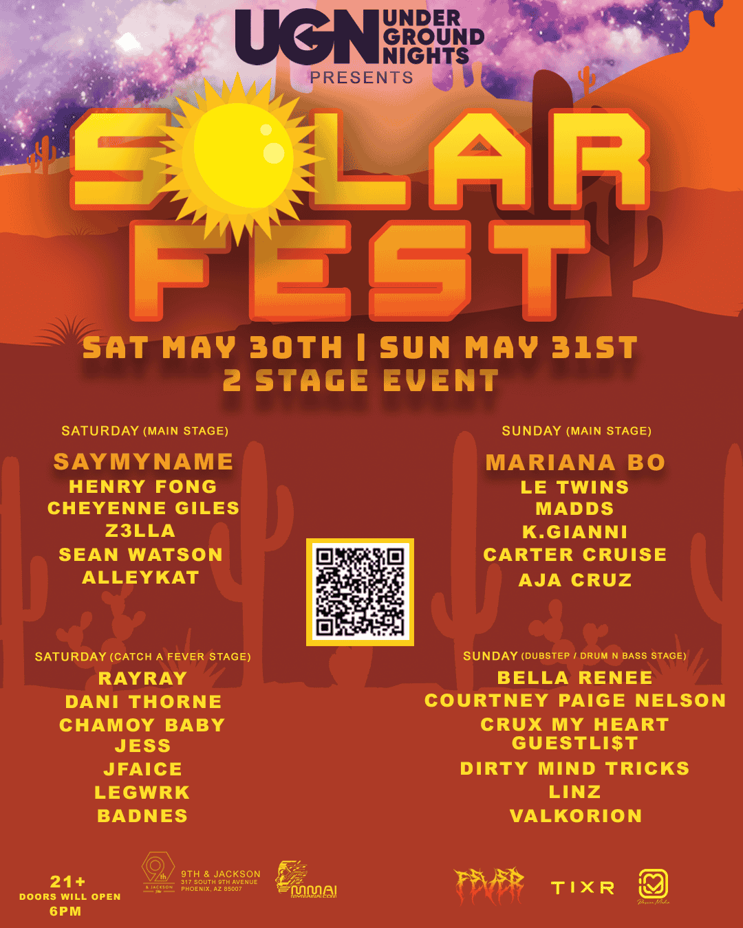 MAIN STAGE (NIGHT ONE) HEADLINER SAYMYNAME Expect hard-hitting, bass-fueled chaos—the kind of set that flips the whole city upside down. This is the closing moment where everything peaks: high voltage drops, nonstop movement, and zero mercy. SUPPORTING HEADLINERS Henry Fong – high-energy festival-level heat, guaranteed to light the room up Cheyenne Giles – bouncy, aggressive, and built to keep the crowd jumping Z3LLA – dark, driving, and dialed in for the underground Harvard Bass – groove meets intensity, the perfect pressure-builder DJ Tranzit – momentum control: tightening the grip and raising the temperature Alleykat – raw energy and crowd-moving selections, no dead air And that’s only ONE stage. TECHNO STAGE – HOSTED BY CIRCUIT AZ Circuit AZ is coming in with a massive surprise lineup designed for the real ones—deep, dark, loud, and relentlessly hypnotic. Lineup reveal coming soon… but understand this now: when the names drop, the underground is going to feel it. You’ve been warned. NIGHT TWO – MAY 31 MAIN STAGE (NIGHT TWO) HEADLINER Mariana Bo A full-force powerhouse bringing live instrumentation and explosive electronic energy—a performance that feels bigger than the room and hits like a main-stage takeover. SUPPORTING HEADLINERS Le Twins K Gianni Madds Carter Cruise Aja Cruz MTBA? TECHNO STAGE – Hosted by Fever Rave LA (Night 2) Arizona… you think you’re ready for this lineup. You’re not. Fever Rave LA is bringing that real LA afterhours pressure — hard techno, relentless BPMs, dark + driving energy, no breaks, no mercy. Not “safe” techno. This is the kind that shakes the room and doesn’t let you breathe. Lineup reveal coming soon… and when the names drop, it’s going to hit different. AZ thinks they’re ready for Fever Rave LA — but you’re not ready for THIS one. TICKETS ARE LIVE NOW Available exclusively on Tixr Early Bird (ONLY 500 available) $25 Single Day $40 Two-Day Pass Prices WILL go up. Once Early Bird is gone — it’s gone.